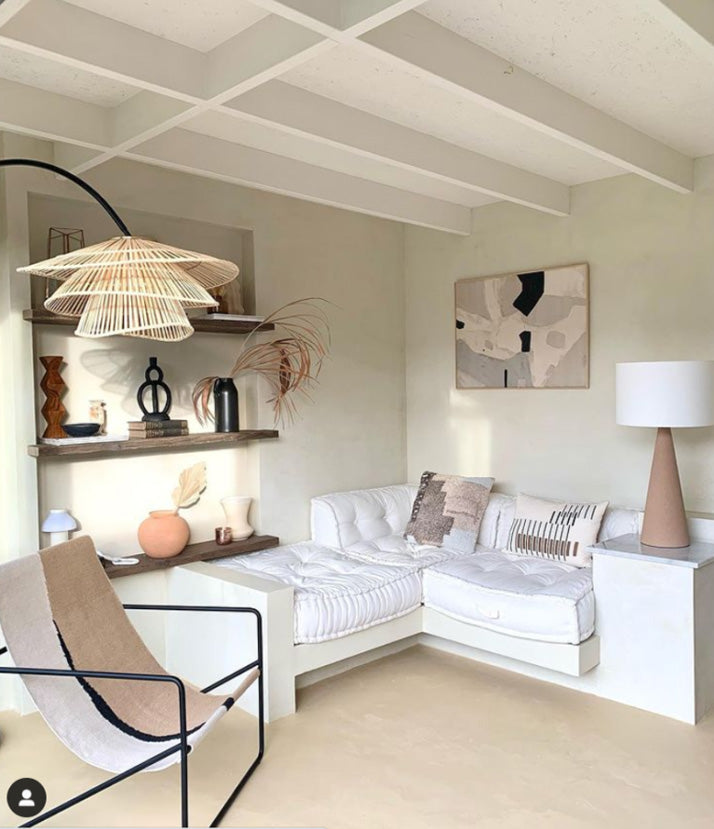 This beautiful room has a glass wall, which smoothly turns into a garden patio. Inside Marisa and Chris have placed a sofa set and a table where you can have breakfast or a romantic dinner. Everything is kept in delicate shades of beige, gray, white and brown. They used beige Festfloor Life microcement on the wall and floor.