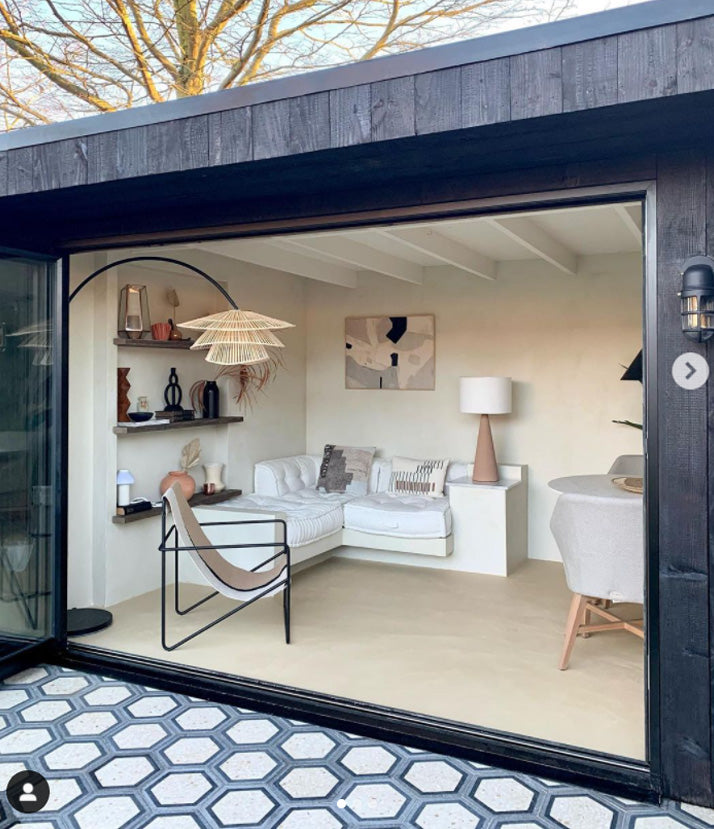 We have been following the renovation of the home of our British clients Marisa and Chris with delight for a long time. The are big microcement fans and we have already shown you their pink microcement bathroom, today it is the time to present some photos of their garden room. In the UK, the weather doesn’t always meet expectations, so a garden room gives the outdoor dining experience no matter what the weather is doing.  It’s also perfect for enjoying the evening sun.
