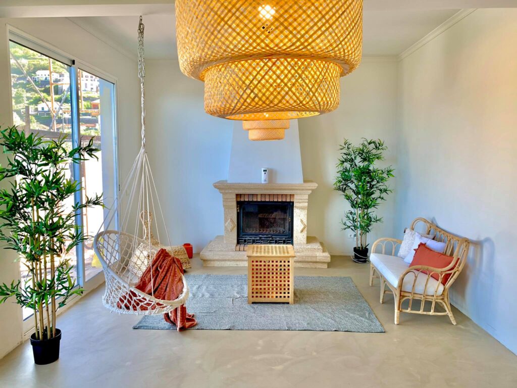 Carolina used gray-sand microcement. It covered the floor in a spacious living room opened to the kitchen, in the hallway and in the bathroom. In turn, gray Festfloor Go! FF9002 decorates the wall in the shower (structural plaster). We love such designs and southern style – so different from the loft or Scandinavian interiors that have been dominating us for years. Here, furniture is Scandinavian – IKEA fits everywhere – but the entire interior is in a completely different style. Beige microcement (colored concrete) and additions of wicker and wood give it incredible coziness. Like the fireplace, which will warm up on cooler evenings. In addition, thanks to the large windows, the house is bathed in sunshine all day, and the nature almost comes inside. The view outside the window is amazing – a paradise garden full of lush vegetation, many species of flowers, beautiful cliffs and terrace fields.