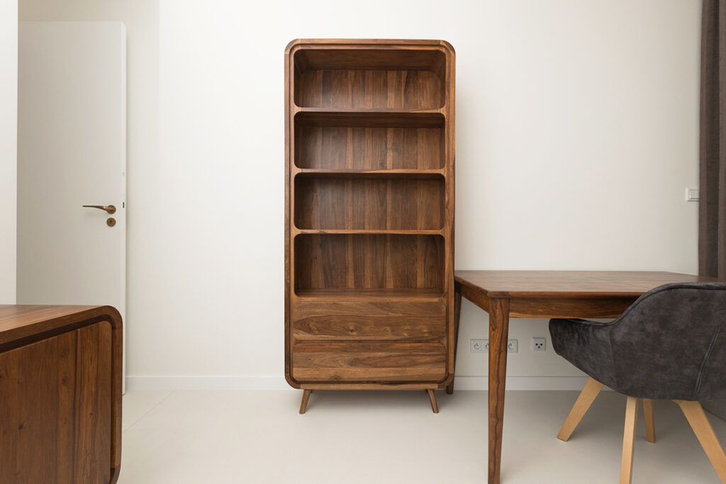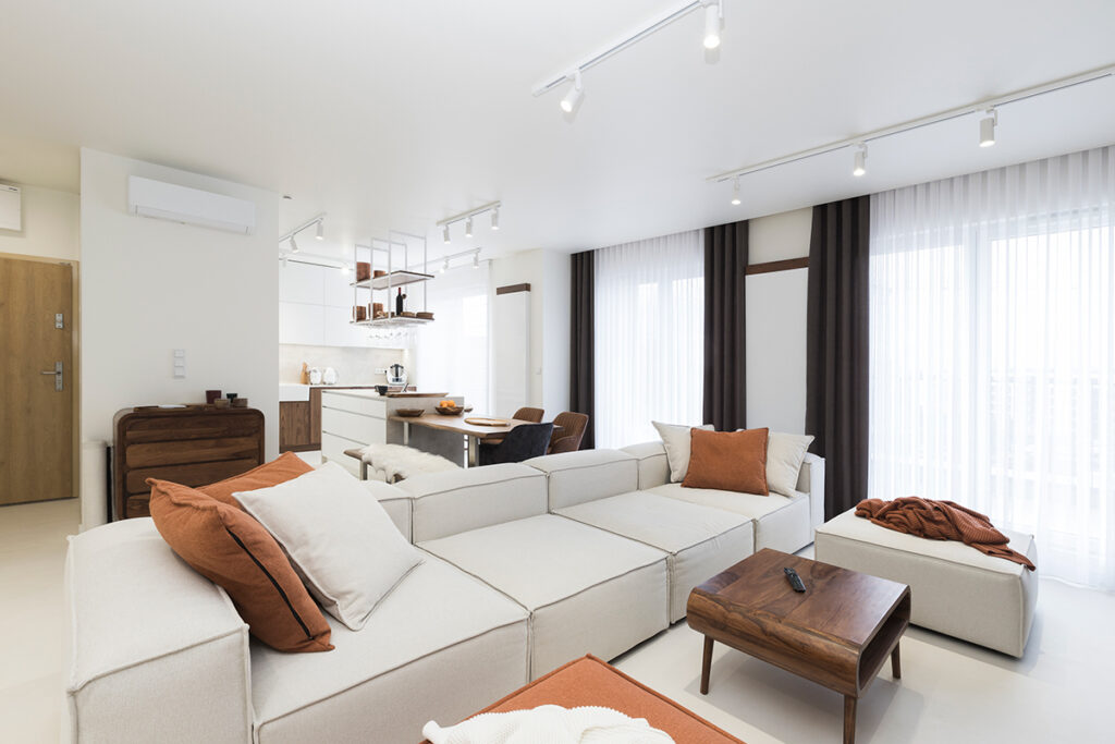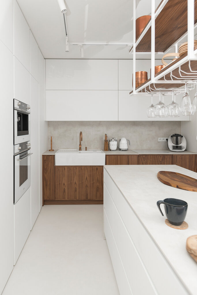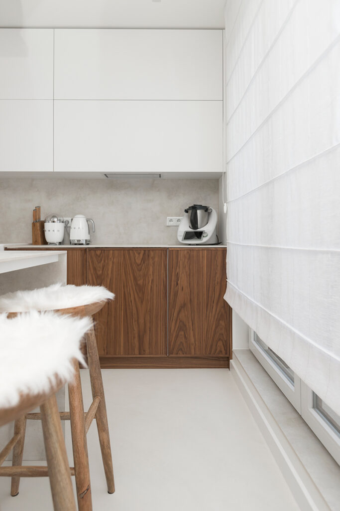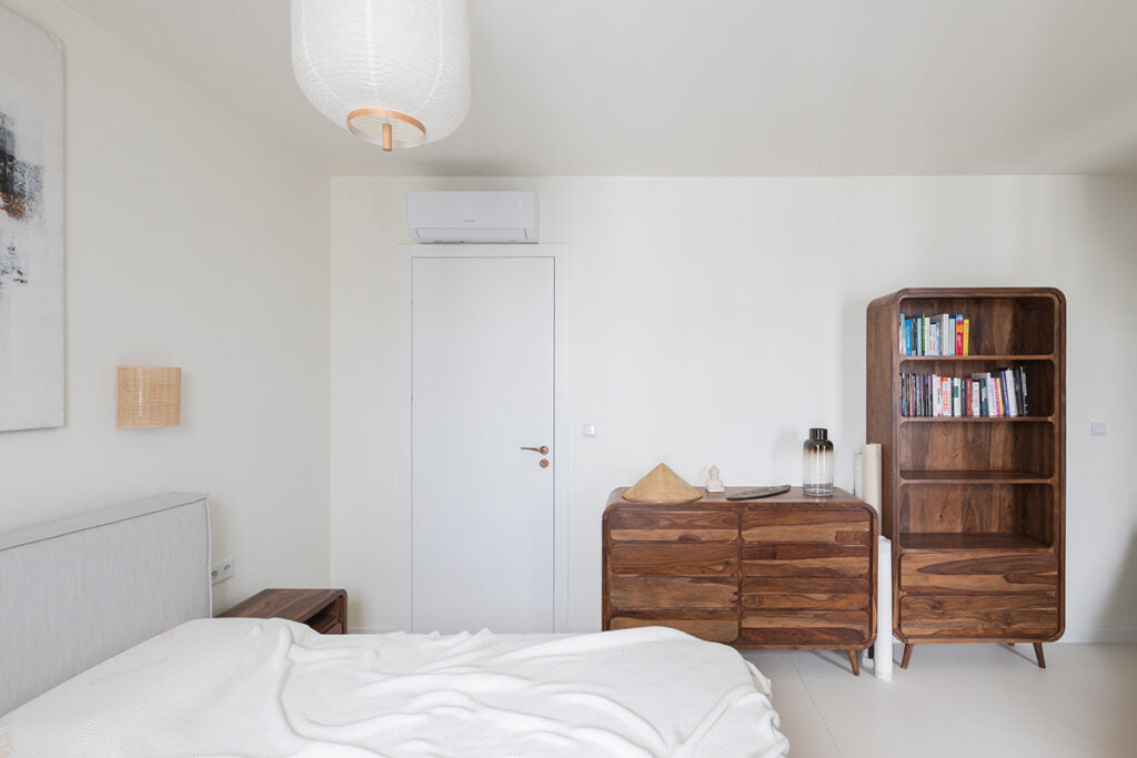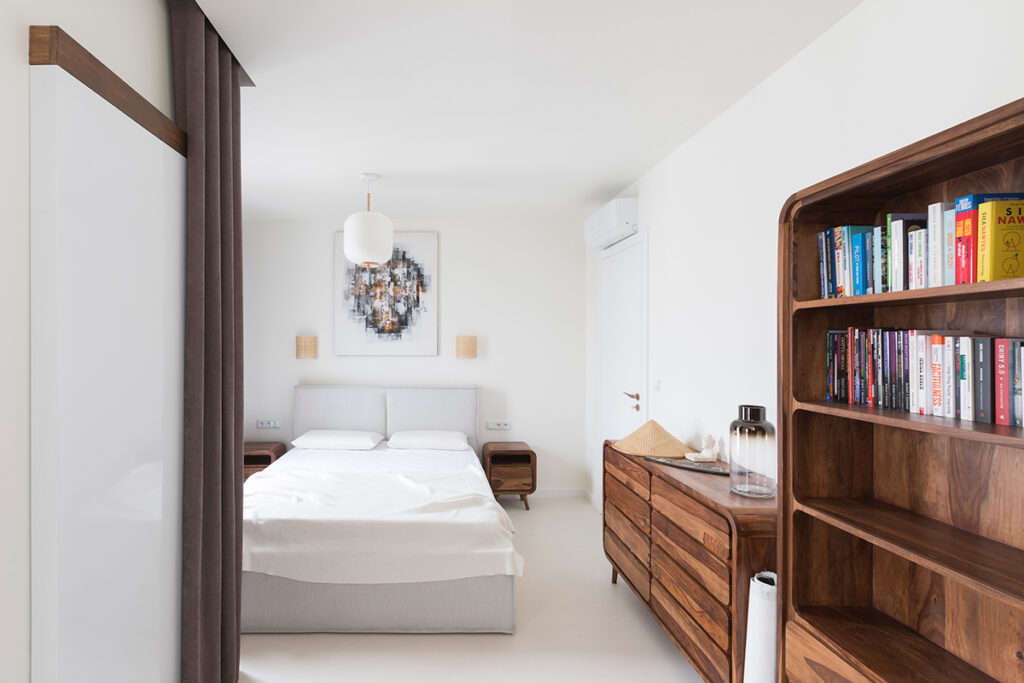 Every home must also not lack a bedroom – a place where we rest and regenerate our strength. That is why it is so important that it is decorated in a way that promotes our comfort and relaxation. In this bedroom, everything has been perfectly composed so that it is a coherent part of the whole house. The elegant white bed that is the focal point of the room, set on a sleek microcement floor, evokes an immediate desire to relax, like in a luxury hotel. Stylish furnishings, such as the abstract painting kept in muted colours, solid wood furniture with rounded shapes and heavy brown curtains, add intimacy and privacy to the room. Delicate openwork and wicker lamps give the interior a pleasantly warm and atmospheric feel. All this adds up to an ideal place for relaxation and regeneration.
