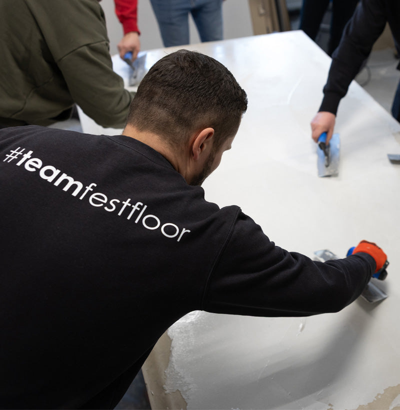 Tak, mikrocement można łączyć z drewnem. Należy jednak zadbać o to, aby podnieść poziom posadzki z mikrocementu do wysokości drewnianej deski, na przykład jeśli deska ma grubość 14 mm, podłoże powinno zostać przygotowane poprzez wykonanie 12‑mm wylewki samopoziomującej oraz 2‑mm warstwy mikrocementu. Dzięki temu obie powierzchnie będą idealnie równe, co zapewni prawidłowe połączenie materiałów.